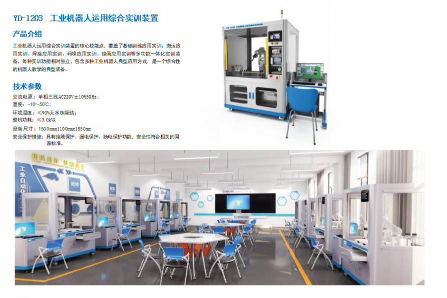 工业机器人运用综合实训装置的核心技能点,覆盖了基础训练应用实训、搬运应 用实训、焊接应用实训、码垛应用实训、绘画应用实训等多功能一体化实训装 备,每种实训功能相对独立,包含多种工业机器人典型应用方式,是一个综合性 的机器人教学的典型装备。